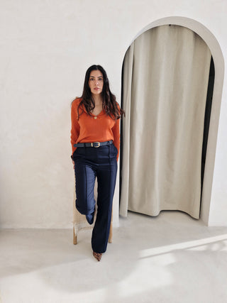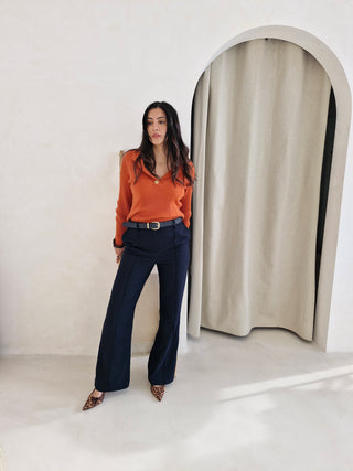 Crafted with a premium wool blend fabric and lined with a cosy recycled fleece. The Simone trousers are the perfect edition to your work wardrobe. In a elegant shade of navy they can be easily mixed and matched with your exisiting wardrobe.